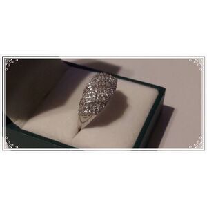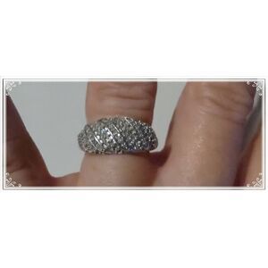 One full carat of genuine natural diamonds are pave set into the dome design. Four diagonal designs are in a raised setting along the dome and also shimmers with small round cut diamonds. The setting is done in 925 solid sterling silver and is stamped for authenticity. It has then been layered in platinum for a lifetime of shine and durability. The dome measures 3/8" in length and it is a size 8. It has no flaws and is in excellent condition.