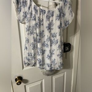 Elegant women's top featuring a beautiful blue floral pattern on a white background. Perfect for casual outings or a day at the office.