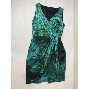 Gorgeous 100% Silk Teal Sleeveless Abstract Print Dress Faux-Wrap Knee Size 8
