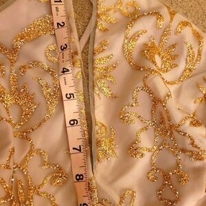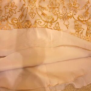Gorgeous pink dress with gold overlay design. New with tags. Juniors Size 16. Perfect for homecoming, or any dressy or holiday event. 100% polyester. Double lined. Center Slit at bust is 7 inches. Dress length from shoulder strap to hem is 38 inches. Bust is 38 inches. See pics for other measurements.