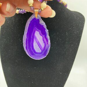 Gorgeous 2.5 in Agate Amethyst Gemstone Raw Edge 22 in Beaded necklace