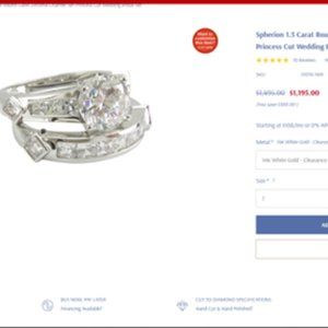 This wedding set is absolutely stunning. It was purchased from Ziamond and has been well maintained. The center stone is a 1.5 CZ surrounded with princess cut CZ accent stones. Total weight is approximately 3.5 carats. The ring is 14K white gold and still available on the Ziamond website for $1,195.00, https://ziamond.com/spherion-1-5-carat-round-cubic-zirconia-channel-set-princess-cut-wedding-bridal-set/. It is a size 7, and I had the bands soldered together to make one ring. Only selling because Hubby recently decided to spring for the real deal! Otherwise I would be keeping this gorgeous set. I receive tons of compliments every time I wear it. Price includes shipping. It will arrive in a black velvet ring box. Selling for less than half of the price of a new set. You won't be disappointed.