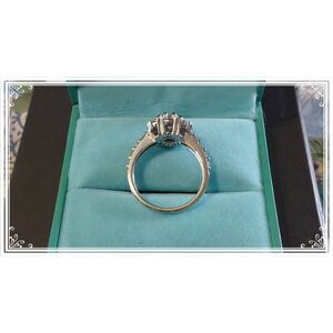 Absolutely stunning ring! Features three carats of genuine moissanite gemstones in a flower cluster halo design with smaller round cut stones down each side of the band. Set in platinum over sterling silver. Retail value: $1099.00