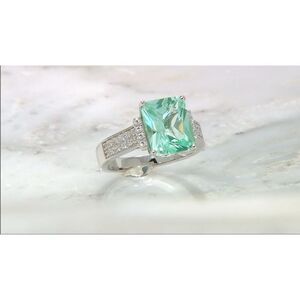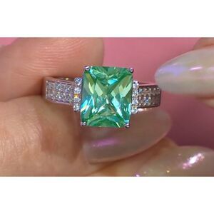 This ring is gorgeous and features the popular sea foam genuine green spinel gemstone. The color of the spinel gemstone is breathtaking. This color gemstone will continue to trend upward in popularity as it is designed to be similar to J.L.O. ‘S engagement ring. The center emerald cut green spinel gemstone is 4.68 carats in gem weight. It measures 11 mm x 9mm in size. On each side of the center stone are .40 carats of small round cut pave set AAA quality simulated diamond gemstones. The band and setting is done with 3.14 grams of .925 solid sterling silver and is stamped for authenticity. It has then been layered in platinum for a lifetime of shine and durability. It is size 8.
