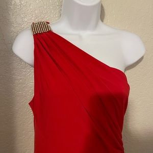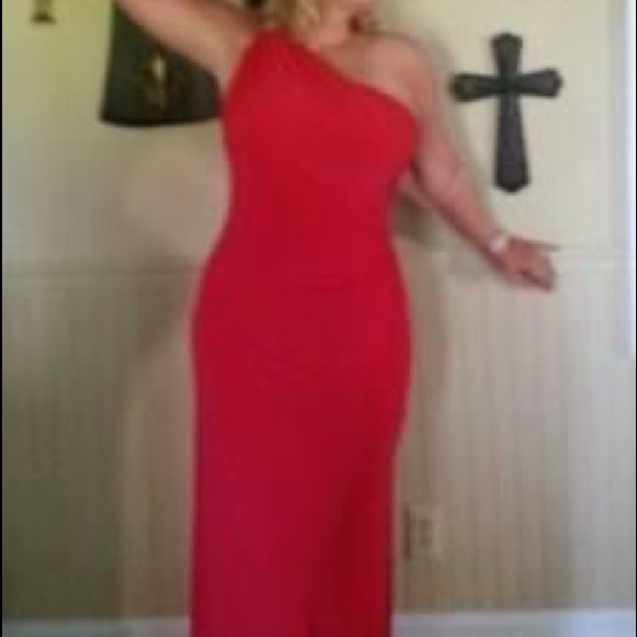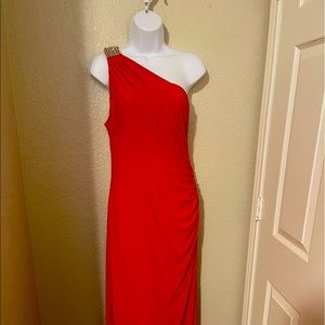 Gorgeous watermelon colored, floor length formal dress. One shoulder with beautiful rhinestone. Only worn once.