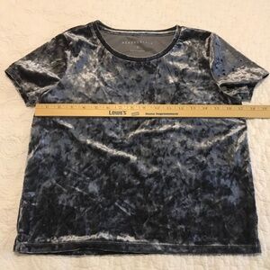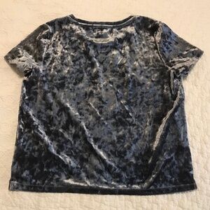 Gorgeous Aeropostale short sleeve dark silver gray crewneck velvet top. Size small. Beautiful sheen! Measurements, materials and care instructions in pics. Preloved, but in excellent shape. Has slits at the hips for ease of wear. Plenty of stretch. Could wear it to the office by itself or as a layering piece paired with a blazer or cardigan, works nicely as a casual top paired with denim. Because of the shine, makes a good add to a holiday or party ensemble!