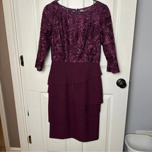 Alex Evenings dress size 6. Gorgeous plum color with a lace and sequined top over a lining with a sweetheart neckline, and a layered, fitted skirt.