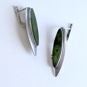 Gorgeous Antique Vintage LARGE Russian Russia Soviet USSR solid Silver 875 bezel set genuine natural Russian Nephrite Jade Cabochon Dangle Drop Pierced Earrings with secure Russian Lock (marked "875 with star, hammer and sickle" and acid tested). They measure about 1 7/16" in length by almost 1/2" in their widest, bezel set genuine Nephrite Jade Cabochons are about 28mm by 7mm each. These unique earrings weigh approximately 11.6 grams and are in great antique vintage used pre-owned condition!