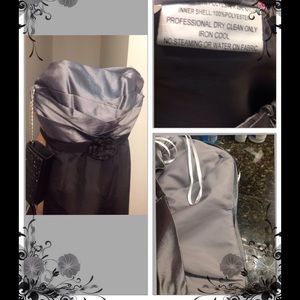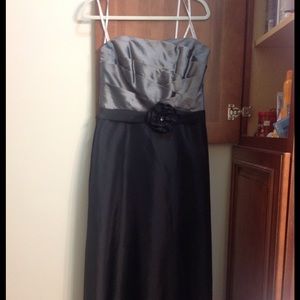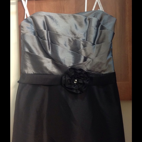 Beautiful gray and black long strapless dress. Worn once as bridesmaid in a wedding. Has been dry cleaned and in great condition! Size tag says 16, but dress was altered to fit size 14.