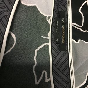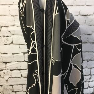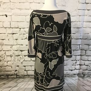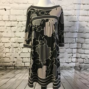 Such great detail in this dress. Cut out sleeves, fantastic neutral pattern but definitely makes a statement. Can be dressed up or dressed down. I believe this to be 100% polyester & thus can machine wash and line dry. Black, grey & taupe with a little white in the borders. I can't find one flaw on it. Length is above the knee. Thx for looking.