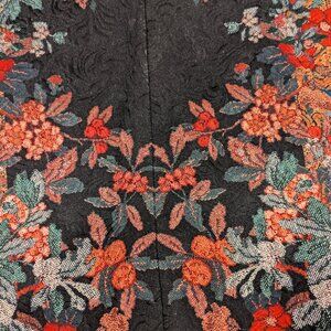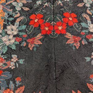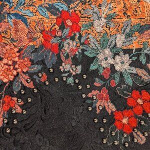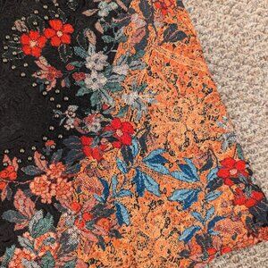 Never worn, Absolutely gorgeous black jacquard skirt from BEBE sz 00. Rich embossed material with nice silky lining on inside. Stunning colorful floral print on the front and back with stud details on the front. Knee length and Back zipper. Smoke free home.