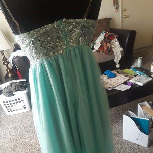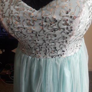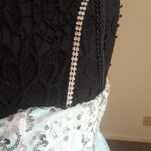Mint Green with sequined bodice. Jeweled straps were added after alterations and can be removed. Slight error in seams along zipper.