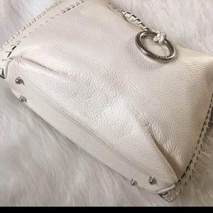 Gorgeous off white signature tote by BCBG, color is off white, signs of wear on bottom corners and interior of handles where your hand grips them. As seen in photos , Tony pen mark on inside of leather bag, comes with dust bag. Small handbag size 11" wide, 10" high with a 4" depth.. open to offers , great little tote to have ..:)))
