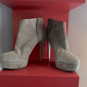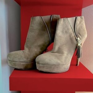 Gorgeous pair of sky high Bebe brown suede booties with fringe accents and faux zipper accents! Sky high 5β & super cute!
