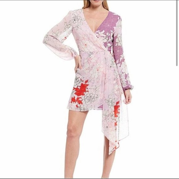 A low-cut neckline and leg-loving length bring allure to this wrap-style mini, while a pair of bold floral prints creates romantic appeal.