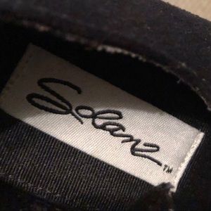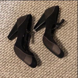 Gorgeous Black & Grays Solanz Velvety Heels. Size 7. These are great ankle strap 3” rounded heels. Comfy and stylish, they will go with anything and make it look good! Gently preowned. See pics as part of description.