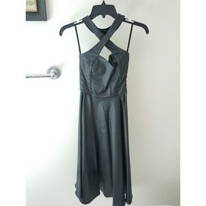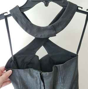 Black pleather sparkle dress. Worn once. Has zipper, and hooks to connect strap on the neck. So pretty on, I got so many compliments! I hate to see it go 😔 It is a pleather material, and it's hard to tell in pictures but it's got a silver sparkle to it. Says XS but a UK 8 is equivalent to a 4 in the U.S. so I'm going to go with that!