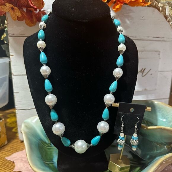 Gorgeous Blue Turquoise & Glass Pearl Handcrafted Necklace 18” Matching Earrings