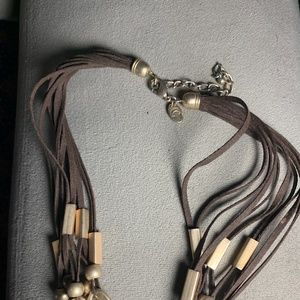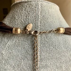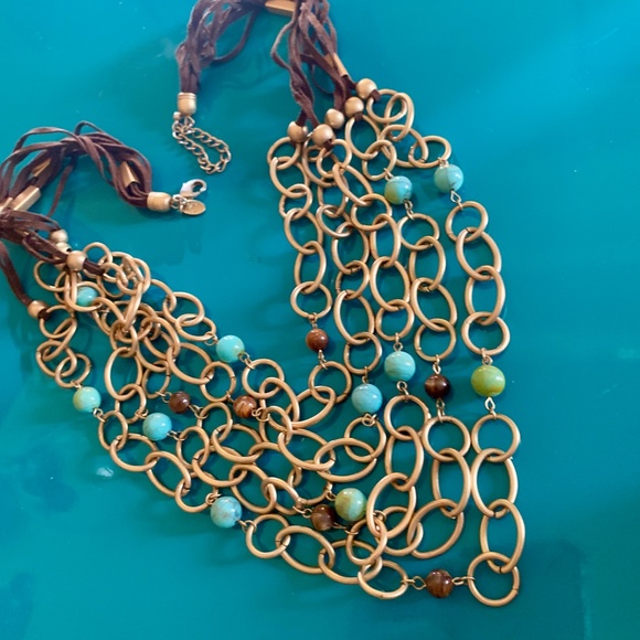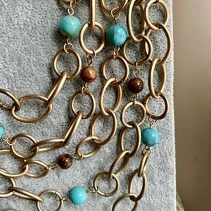 Well made and nice weight - featuring dark brown suede cord and brushed antiqued chain with faux turquoise & brown beads throughout.