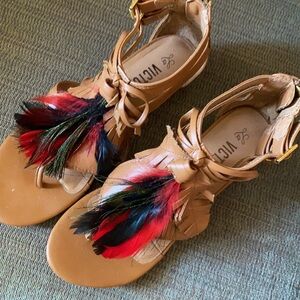 Soft leather sandals with leather feather and bows and real feather details in size 7. Worn just a few times, these sandals feature double clasp sides with a zipper in the back.