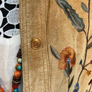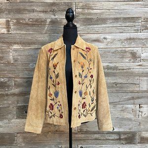 Be prepared to fall in love with this jacket! Whether your style is boho or western, this soft suede jacket will be the perfect accent. Adorned with embroidered bright flowers this jacket will make a fun, unique statement. There is a small mark on the sleeve, less than .5'', around the elbow. The last two pictures are of the mark. Last picture is dark so you can see the mark better.