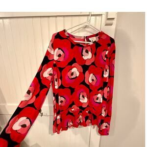 Simply stunning peplum Kate Spade red and pink bold blouse, perfect for work or play. Floral, almost geometric or art deco pattern. Dry clean only. Measurements: L: 24.5, Pit to Pit: 21, Arm length: 25.