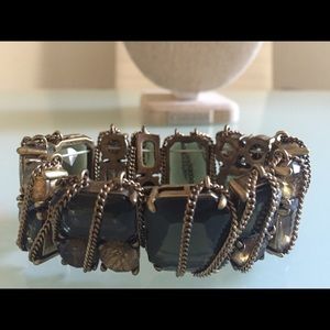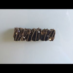 Smoky mixed tone jewels with delicate antique gold chains wrapped throughout. Gorgeous piece and adjusts to fit due to internal expandable band. Perfect for those with a medium to large wrist. Excellent condition.