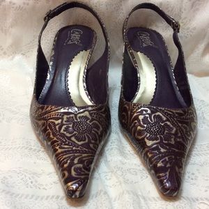 PRICED TO SELL🌹Looking for a Posher who would also ❤️ these gorgeous CARLOS SANTANA Patterned Leather Heels. Marked "DISCREET" as the design for these lovely , lovely shoes. Made of leather upper in patterned dark purple and gold. The 2" heels are made of carved wood, very unique... These were barely used and still in excellent condition. I live in the country now so I don't think I could use these anymore. I have the box but a little worn and dented if you want it.