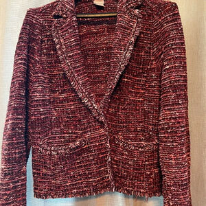 This is an absolutely gorgeous, structured Chicos cardigan sweater jacket. This has beautiful colors of pink ,rose and raisin Hidden snap closure in the front with functioning pockets. This has plenty of stretch since it is a sweater and can be dressed up or down depending on your mood. Feel free to ask any questions or make an offer