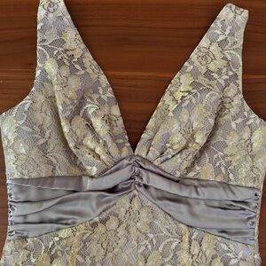 Beautiful tea-length party dress perfect for any special occasion. V-neck fitted bodice with flared skirt and invisible back zipper. Beautiful metallic gold lace overlay with taupe lining.
