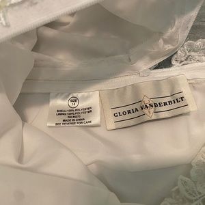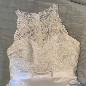 This beautiful wedding dress is in perfect condition. Beaded and embroidered bodice with a delicate bow at the waist and button down look but zipper closure for ease of wear. The front of the skirt is also beaded and embroidered and carries through to train. There are layers of stiff tulle under the skirt underneath and it comes with an additional crinoline (pictured) for extra body.