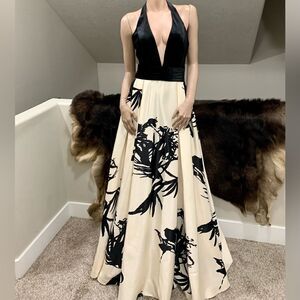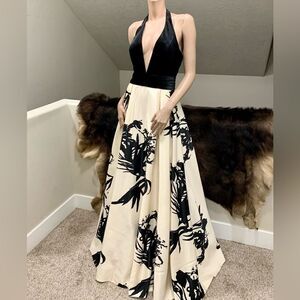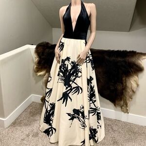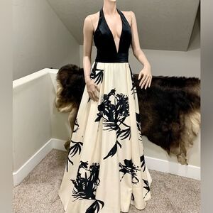 Gorgeous, Deep V-neck Velvet with Satin Twill Floral Print Halter Ball Gown