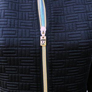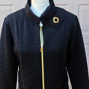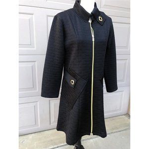 Statement piece! Excellent condition with little wear. The only wear is markings on the gold pieces at collar and pockets. Lightweight like a jacket but styled like a coat. It is MUCH prettier in real life than in the photos. Textured fabric is very nice with a beautiful gold zipper. Flared at the bottom.