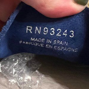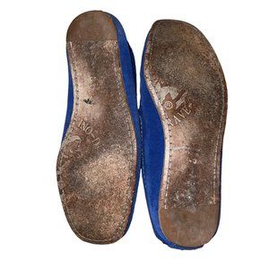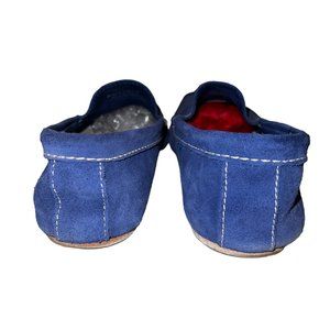 These are gorgeous unisex loafers in a beautiful blue suede with light blue stitching around toe and tan stitching around sides and back.