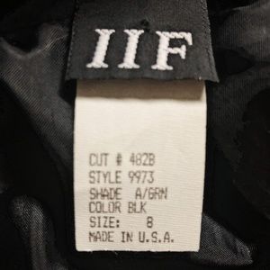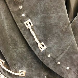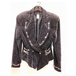 This one-of-a-kind distressed black IIF jacket rocks. Fully lined, impeccably tailored and in perfect condition. Made of beautiful suede-look brushed rayon, with killer rhinestone embellishments. Wear it with jeans or LBD and rock the room. Size 8.