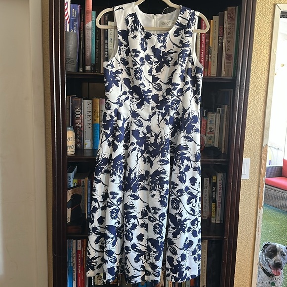 Blue and white fully lined Eliza J dress. 32” waist 19” pit to pit and 43” shdr to Hem. EUC