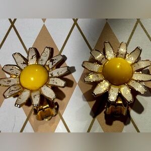 Gorgeous Estate Yellow White Enamel Daisy Flower Vintage Earrings
