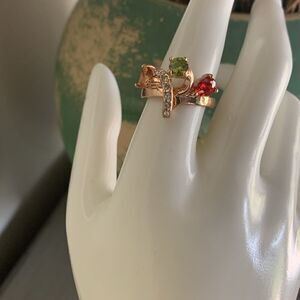 Stones are in triangular, pear, and square and in colors of Garnet, Peridot, and Citrine Yellow and clear CZs adding to the beauty of this ring