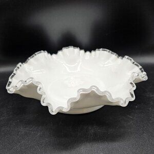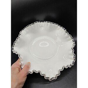 This Fenton centerpiece bowl is a stunning addition to any collection. With its 8-point silver crest and milk glass production style, it exudes elegance and sophistication. The bowl is perfect for displaying candy, fruit, or any other centerpiece items. The brand is well-known for its high-quality glassware, and this bowl is no exception. The white color adds a touch of class to any table setting and is sure to impress guests. This item is a must-have for any collector or lover of fine glassware. Measurements in photos.  Pre-owned in excellent condition