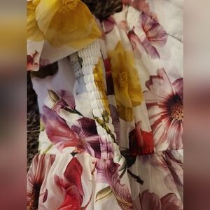 Stunning AJE Fleur Mini Dress featuring a gorgeous collage floral print that's perfect for any special occasion! This beautiful dress showcases a flattering fit-and-flare silhouette with a romantic low scoop neckline enhanced by delicate ruched detailing and a cutout pattern on the back. Has shirred side panels for additional fit flexibility. The dramatic puff sleeves add a touch of vintage charm while the convenient side pockets provide both style and functionality. Crafted from a luxurious blend of 50% Tencel, 38% Linen, and 12% Nylon for comfort and breathability. From a smoke, pet and fragrance free home.