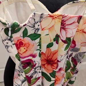 Never worn ! Absolutely gorgeous and colorful floral print corset and pencil skirt set from GUESS. Corest is XXS and skirt is XS- stretchy scuba material. Corset is padded with adjustable straps and pleated front, with side zipper. Pencil skirt has back slit. both have rich silky lining on the inside. Bright, cheery and colorful! Smoke free home.