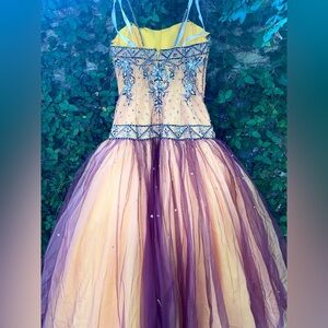 Has a yellow/golden background with maroon overlay. Bodice encrusted in rhinestones in ornate flower pattern with black stitching and Rhinestone straps