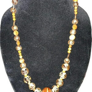 Get ready to turn heads with this gorgeous fall color glass bead necklace and earrings! The rich hues of amber, mahogany and yellow will add a pop of autumnal charm to any outfit. This set is a unique and is perfect for adding a touch of boho chic to your wardrobe. Don't miss out on this one-of-a-kind treasure!