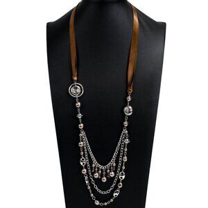 Gorgeous Gold Silver & Brown Beaded Ribbon Fashion Necklace