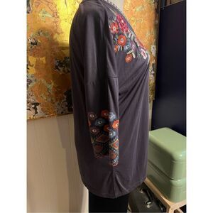 This is a beautifully embroidered tunic from paparazzi! Kind of a Johnny was style. This has floral embroidery heavily across the entire front and on the cuffs with a geometric pattern as an accent. This is a very soft viscose and spandex blend, and there are small side slits at the hips. This is an excellent condition could be new without tags no signs of wear whatsoever. Machine washable.
