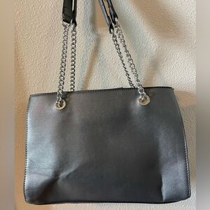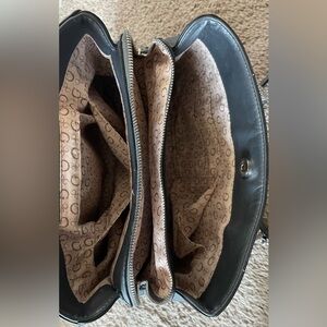 This beautiful gray leather bag has the signature G pattern along with 2 embroidered roses. It has 3 main pockets- the middle one zips. One of the side pockets has one pocket in it, and the other one has one pocket with 2 card pockets which can also hold other things. The leather has a few "dents" from being stored but I'm sure they'll come out with use. Measurements in photos