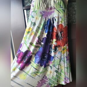 This maxi dress by nani kai is a beautiful watercolor patterned piece that exudes boho charm. Made from silk and featuring a sleeveless design with a round neckline, this pullover dress is perfect for travel, parties, or casual outings. The multicolor palette and midi length make it ideal for summer and spring seasons. The dress is one size and should be hand washed to maintain its quality. With its colorful theme and stylish options like tank dress, shift, slip dress, and sundress, this garment is a versatile addition to any woman's wardrobe.