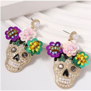 These sugar skull earrings are STUNNING! 3d Sequinned flowers and covered in rhinestones with black rhinestones for the eyes.