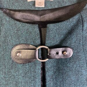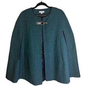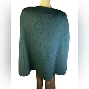 This stunning cape jacket is super sharp and easy to wear. It’s an extra small, but easily fits up to a size 6. From Joan Rivers, this cape is a jewel toned green with black vegan leather finishes, and is 70% polyester and 30% wool. Excellent condition, worn only twice.