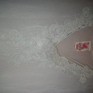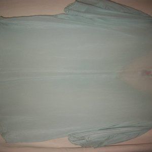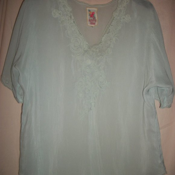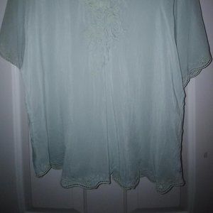 This blouse is a very light blue, just beautiful. Slightly sheer with embroidery along neckline, sleeves and hem. About 25" from shoulder to hemline. Could wear with a cami or pretty bra under. Light weight cupra rayon that is washable. Very good condition with no holes.